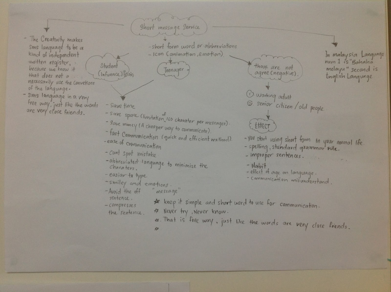 Number six is my final Topic called "SMS(Short Message Service). A lot of people was thinking using sms will destroy English Language. Example like school work ( will influence student in paper work using short form), Teenager (they normally habit using whole sentences). For Foreigners would be more officially to English